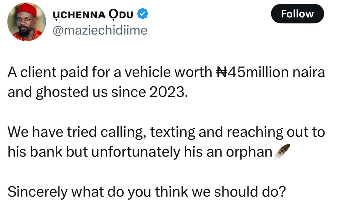 “Customer paid in full, ₦45 million, no questions asked. But since then, no calls, no collection, nothing. The car is still parked in my garage. I’m starting to get worried,” he posted.